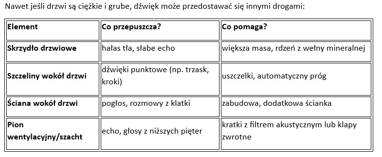 Bo różne konstrukcje drzwi radzą sobie z nimi różnie. Drzwi o wysokiej masie i grubości dobrze tłumią hałas tła, ale punktowe dźwięki mogą „przebić się” przez szczeliny lub rezonować w ościeżnicy.